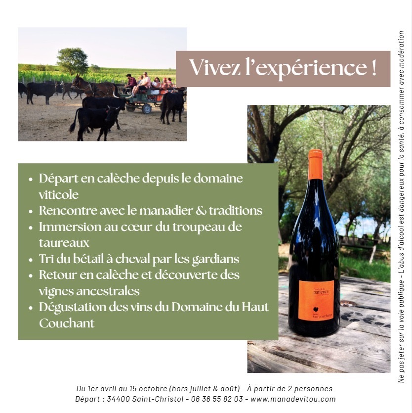 Nicolas Vitou, guide-manadier passionné son enfance, vous invite à découvrir son élevage de taureaux et de chevaux Camargue. Dans une ambiance conviviale et respectueuse de l’environnement, profitez de visites privatives en calèche qui permettent d'explorer le domaine, suivi d'un apéritif local et possibilité d'acheter les produits de la Manade sur place (viande en vente en direct, savon de lait de jument, foulard traditionnel et couteau du gardian). Ces visites sont accessibles à partir de 4 personnes.